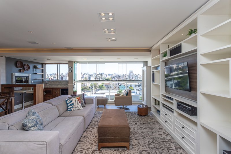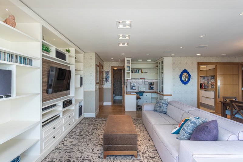 Apartamento à venda semi mobiliado, ficam todos os fixos (saem 2 splits, sala e quarto). São 3 dormitórios: 1 suíte com closet e 2 dormitórios com suíte americana. Cozinha com area de serviço. Living para 3 ambientes, sacada integrada, churrasqueira lavabo e escritório. Posição solar Leste/Norte (sol da manhã).