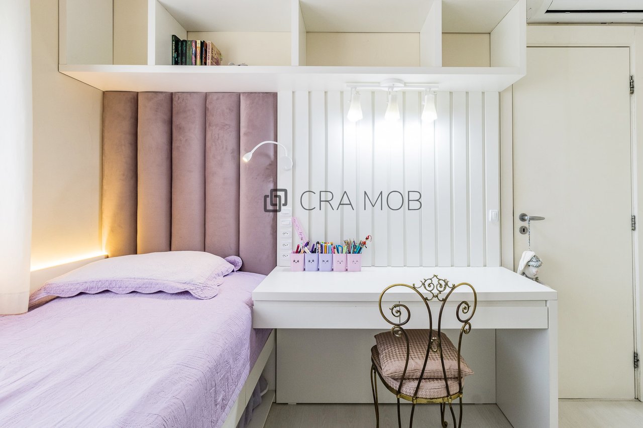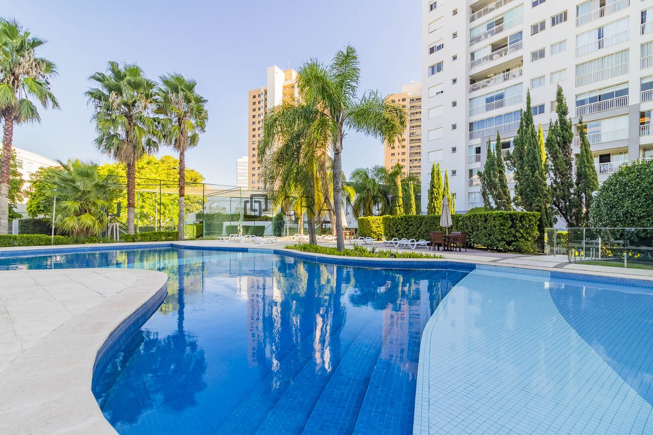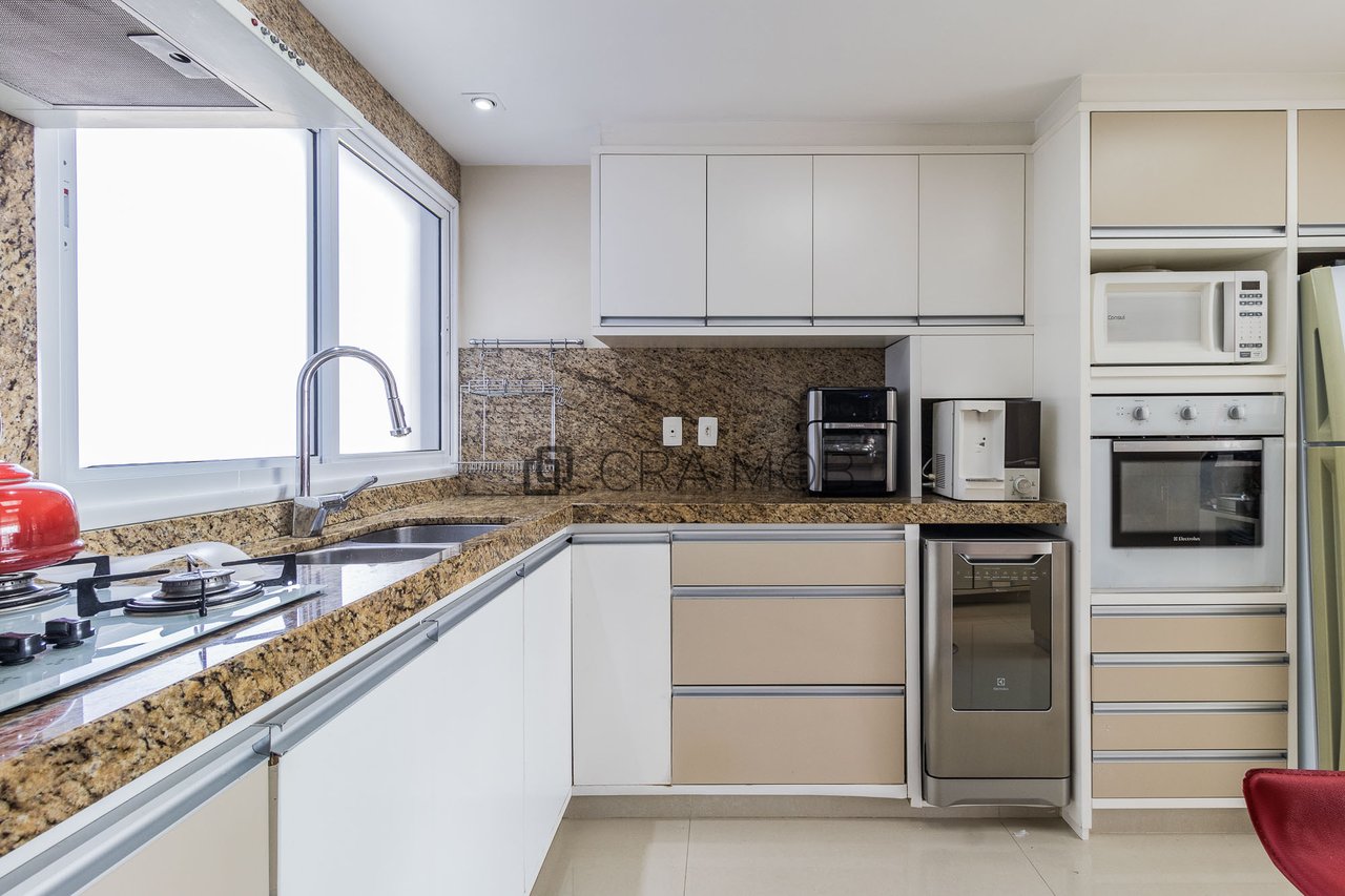 A cozinha planejada é separada da área social por portas de correr maciças, trazendo praticidade ao ambiente. O apartamento conta ainda com um lavabo elegante, com cuba de mármore iluminada, e quartos reformados, todos climatizados com splits.